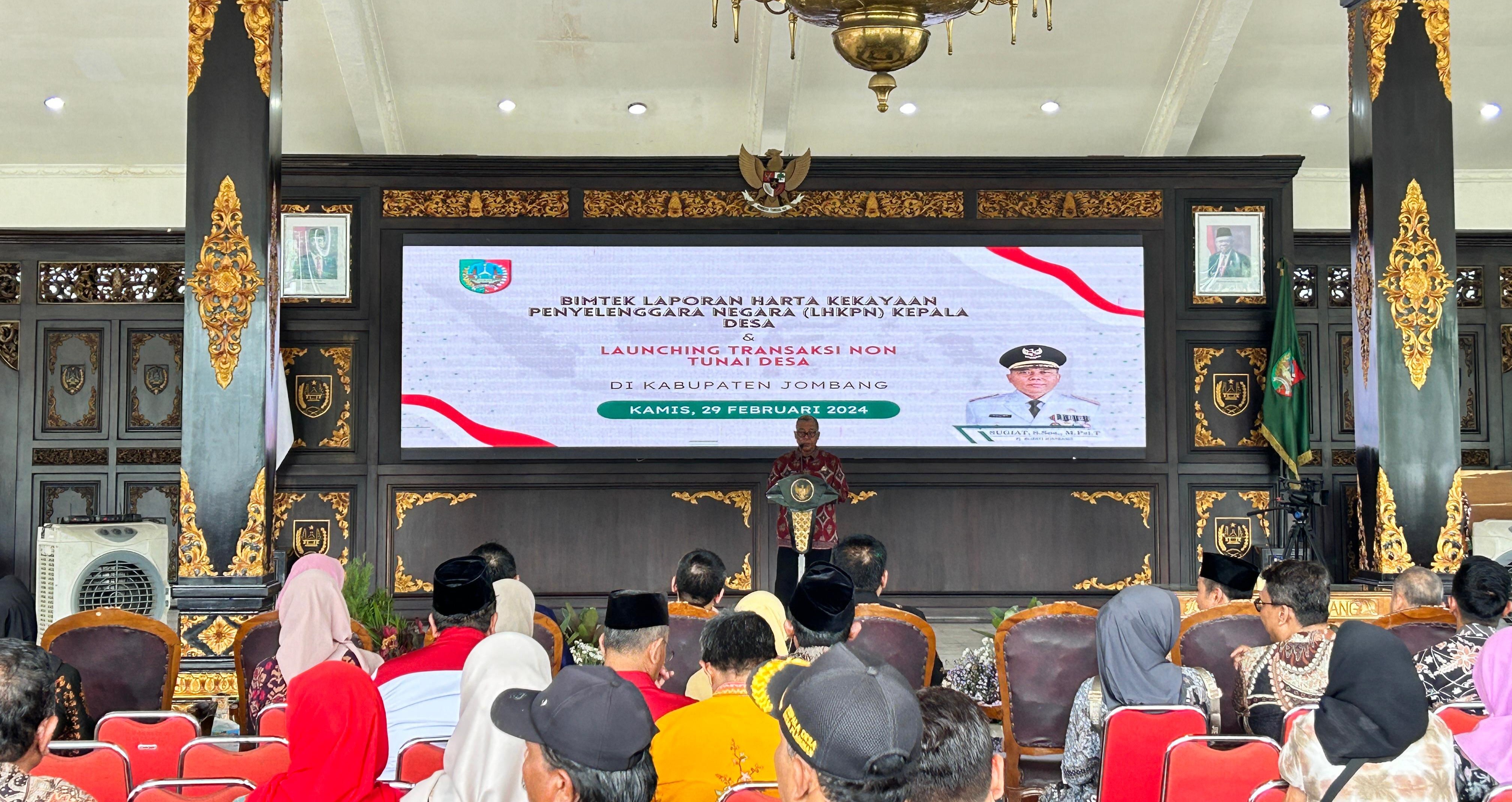 Dinas Pemberdayaan Masyarakat dan Desa (DPMD) menyelenggarakan bimbingan teknis (bimtek) Laporan Harta Kekayaan Penyelenggara Negara (LHKPN) Kepala Desa dan Launching Transaksi Non Tunai Desa yang dilaksanakan di Pendopo Kabupaten Jombang, pada hari Kamis (29/02).
