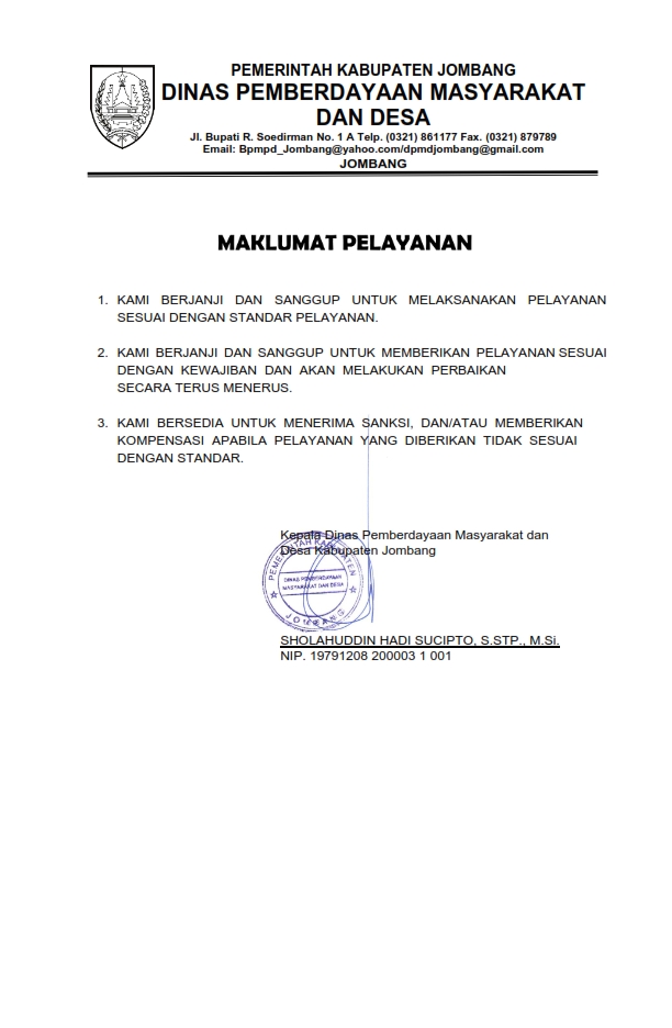 Maklumat/Janji Layanan Unit Penyelenggara Pelayanan Dinas Pemberdayaan Masyarakat dan Desa Kabupaten Jombang