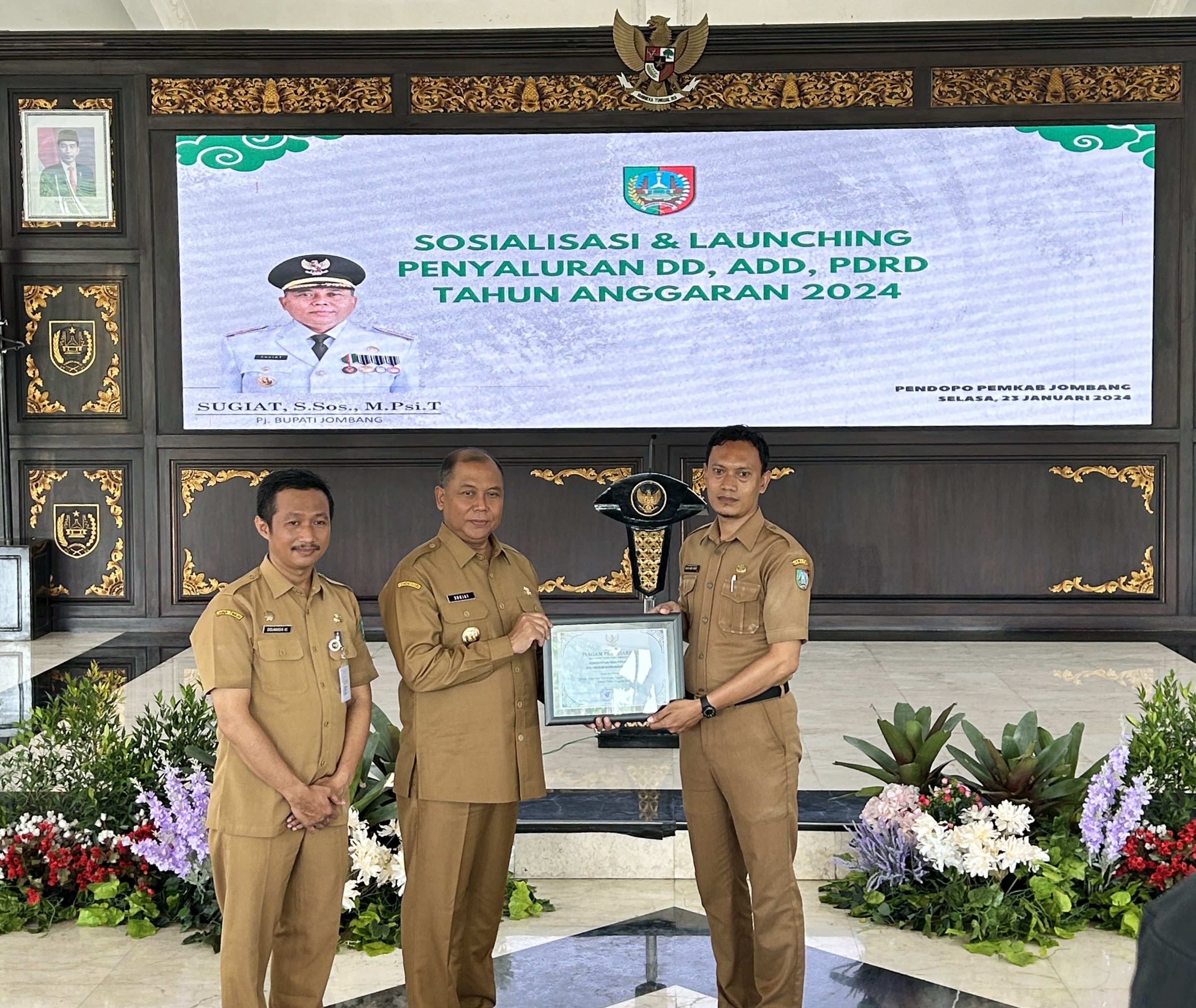 Dinas Pemberdayaan Masyarakat dan Desa (DPMD) meluncurkan penyaluran Dana Desa (DD), Alokasi Dana Desa (ADD), Pajak Daerah dan Retribusi Daerah (PDRD) Tahun Anggaran 2024. Penjabat (Pj) Bupati Jombang, Sugiat, S.Sos, M.Psi.T, memimpin acara peluncuran di pendopo Kabupaten Jombang pada pagi Selasa (23/01/2024).